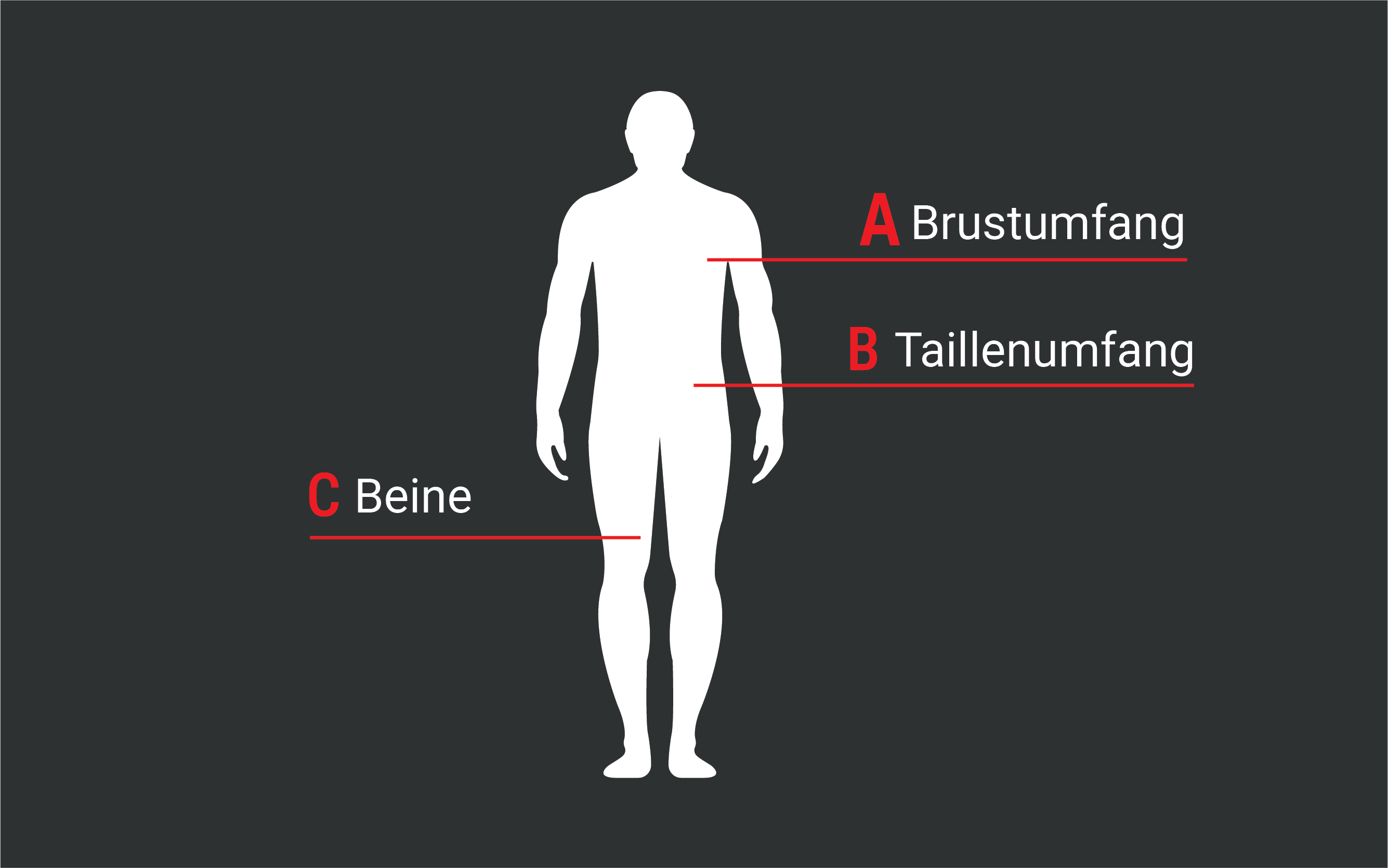Um deine passende Größe zu bestimmen, miss bitte nach den in der Abbildung angegebenen Punkten:
