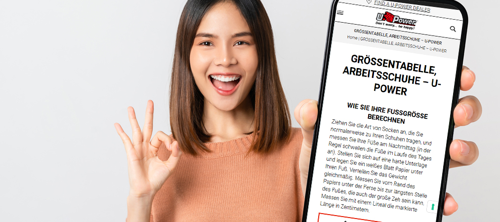 Wenn Sie mehr zu diesem Thema erfahren möchten, konsultieren Sie unseren U-Power-Größenratgeber, um den für Sie am besten geeigneten Arbeitsschuh zu finden!
