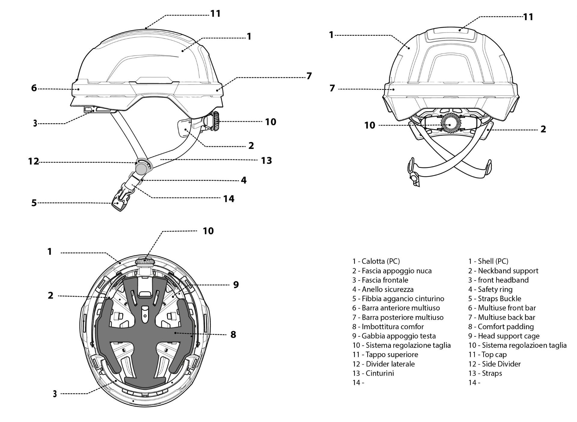 Before using the helmet, read these instructions carefully; failure to follow them may reduce the safety offered by the helmet. Before using the helmet, check its integrity in all its parts. The helmet must be checked periodically, and in any case before each use, for any damage. It is up to the employer to choose the most suitable PPE, but it is up to the helmet user to check its suitability. Following a violent impact, even if the damage is not visible, replace the helmet, as it may have exhausted its capacity to absorb further impacts and provide the protection expected.