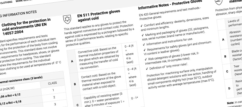 In addition to this main standard, there are more detailed ones based on specific protection characteristics, such as mechanical risk, cut risk, heat protection, etc., which must be highlighted on the glove with a pictogram.