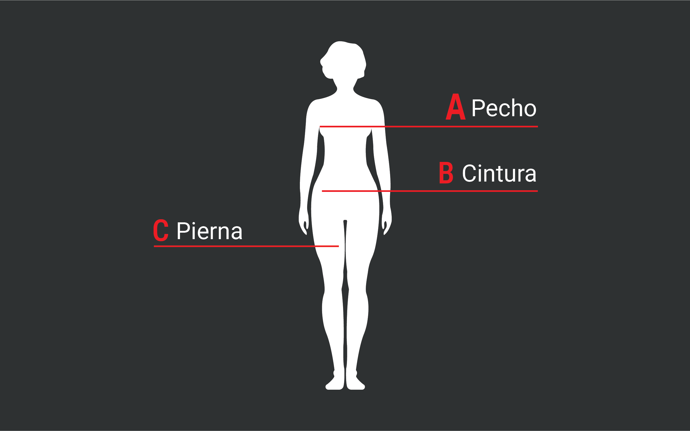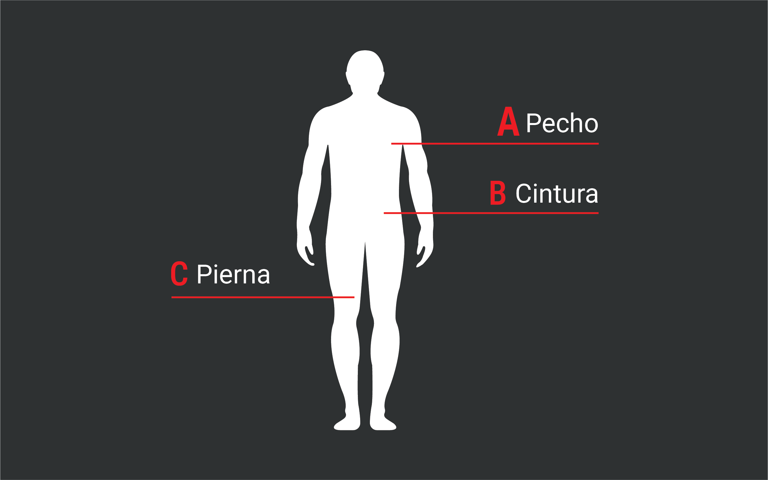 A - Pecho: mide la circunferencia en el punto más ancho del pecho, sujetando la cinta métrica horizontalmente.
