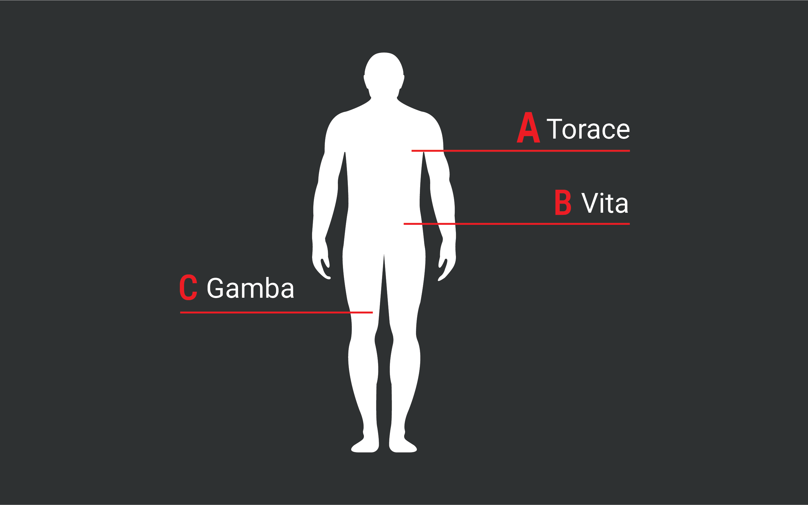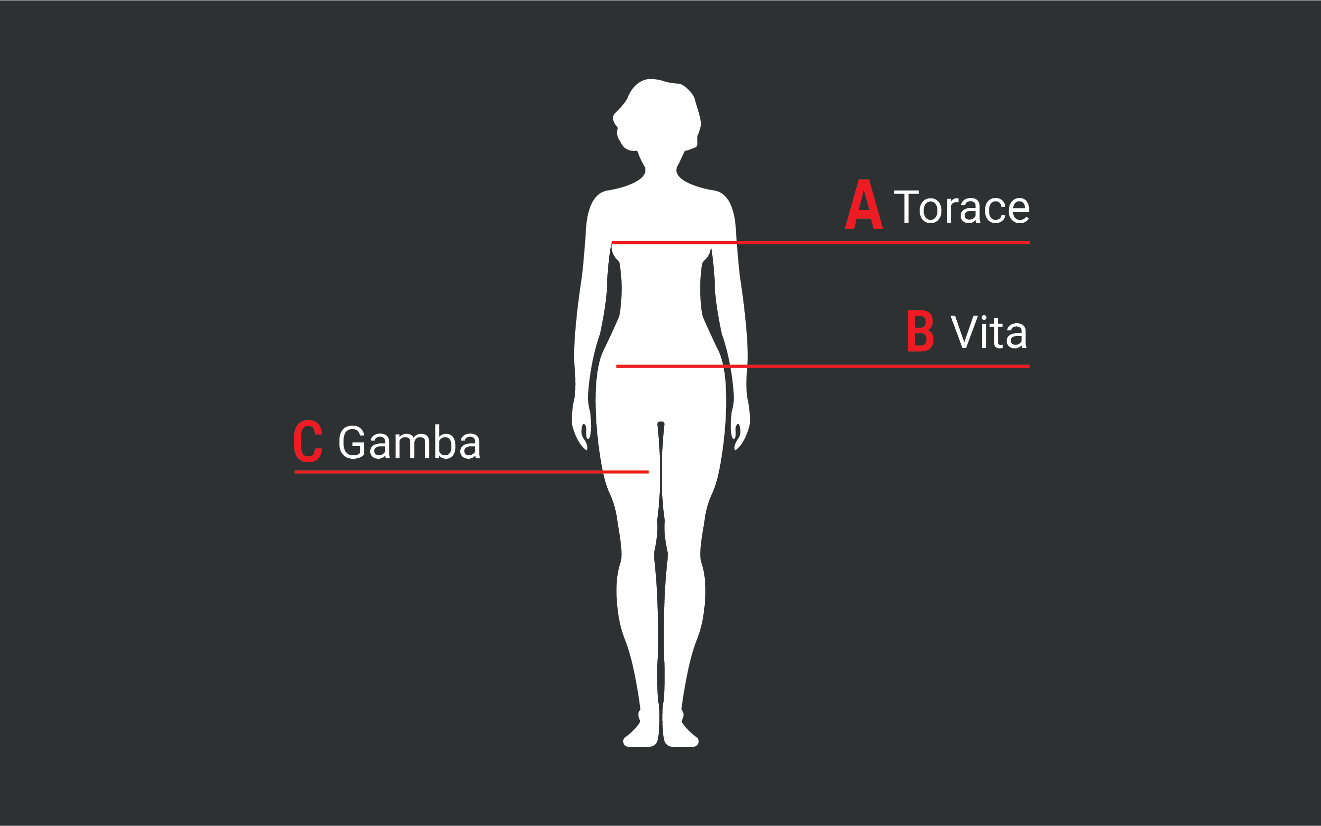 A – Torace: misura la circonferenza nel punto più ampio del petto, tenendo il metro ben orizzontale.