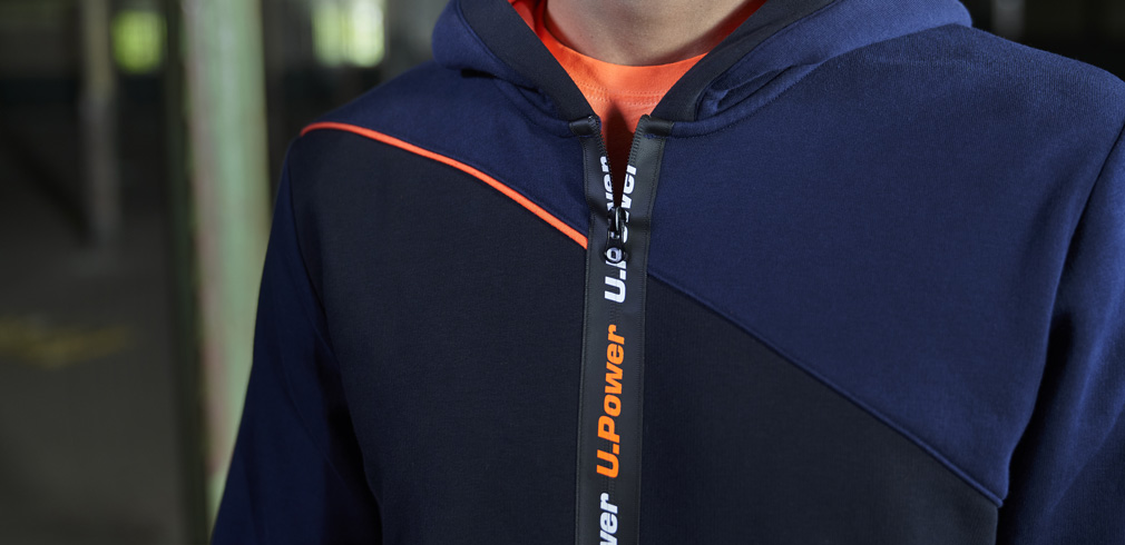 La chiusura centrale è impermeabile ed è arricchita dalla serigrafia con logo U-Power e da inserti in piping elasticizzato.