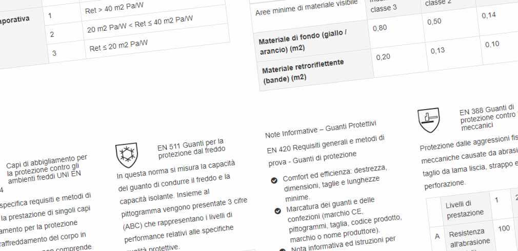 La normativa europea di riferimento è la EN ISO 13688:2013. Questa normativa definisce i requisiti di prestazione generale per ergonomia, innocuità, designazione delle taglie, durabilità, compatibilità, marcatura degli indumenti di protezione e informazioni che devono essere fornite dal fabbricante assieme all’indumento di protezione antinfortunistica.