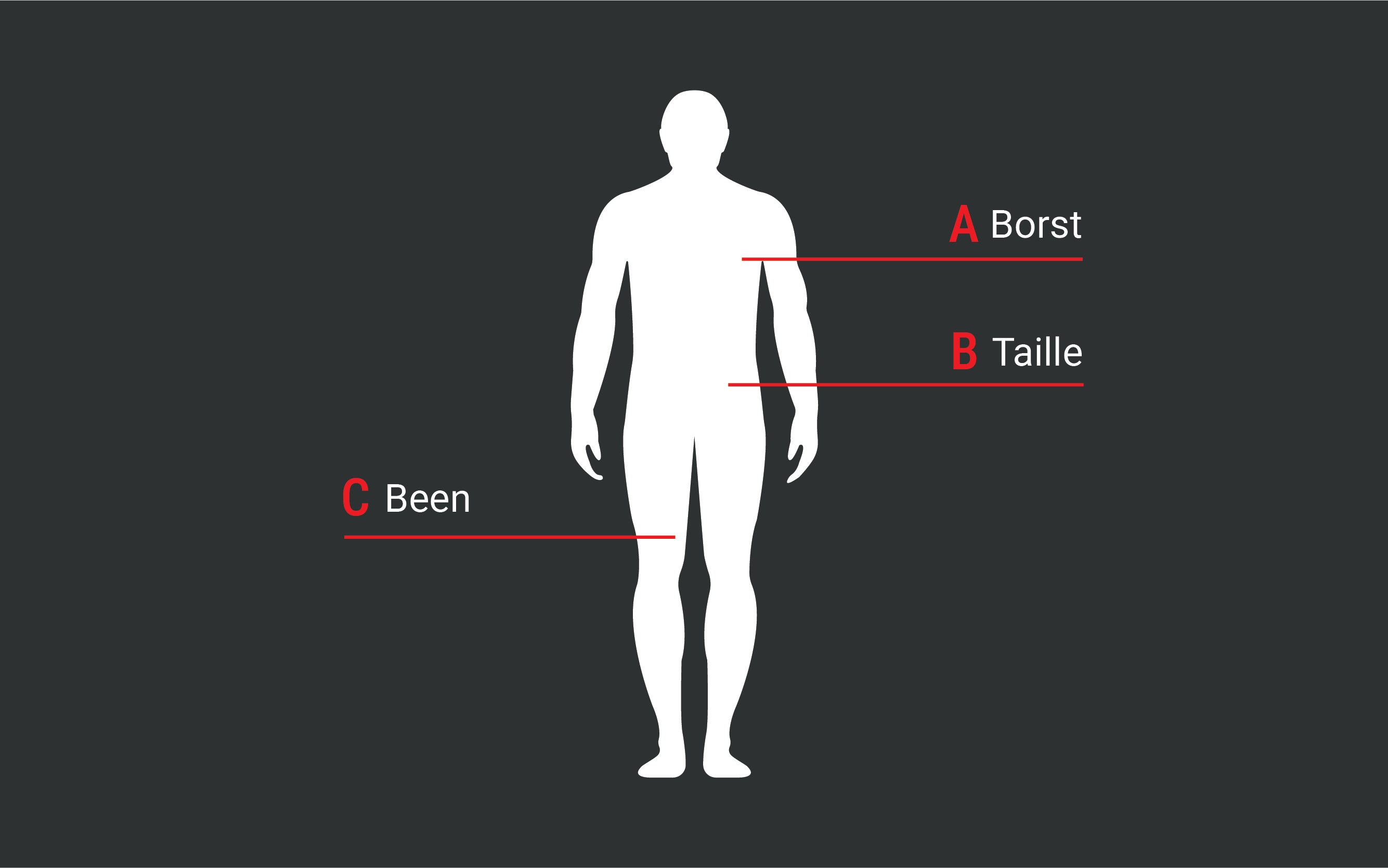 A - Borst: meet de omtrek op het breedste punt van de borst, waarbij je het meetlint horizontaal houdt.
