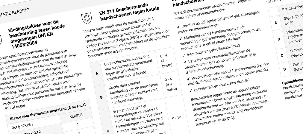 Naast deze hoofdvoorschriften zijn er meer gedetailleerde voorschriften op basis van specifieke beschermende kenmerken, zoals mechanisch risico, risico op snijwonden, hittebescherming, enz. die op de handschoen zelf moeten worden aangegeven door middel van het desbetreffende pictogram.