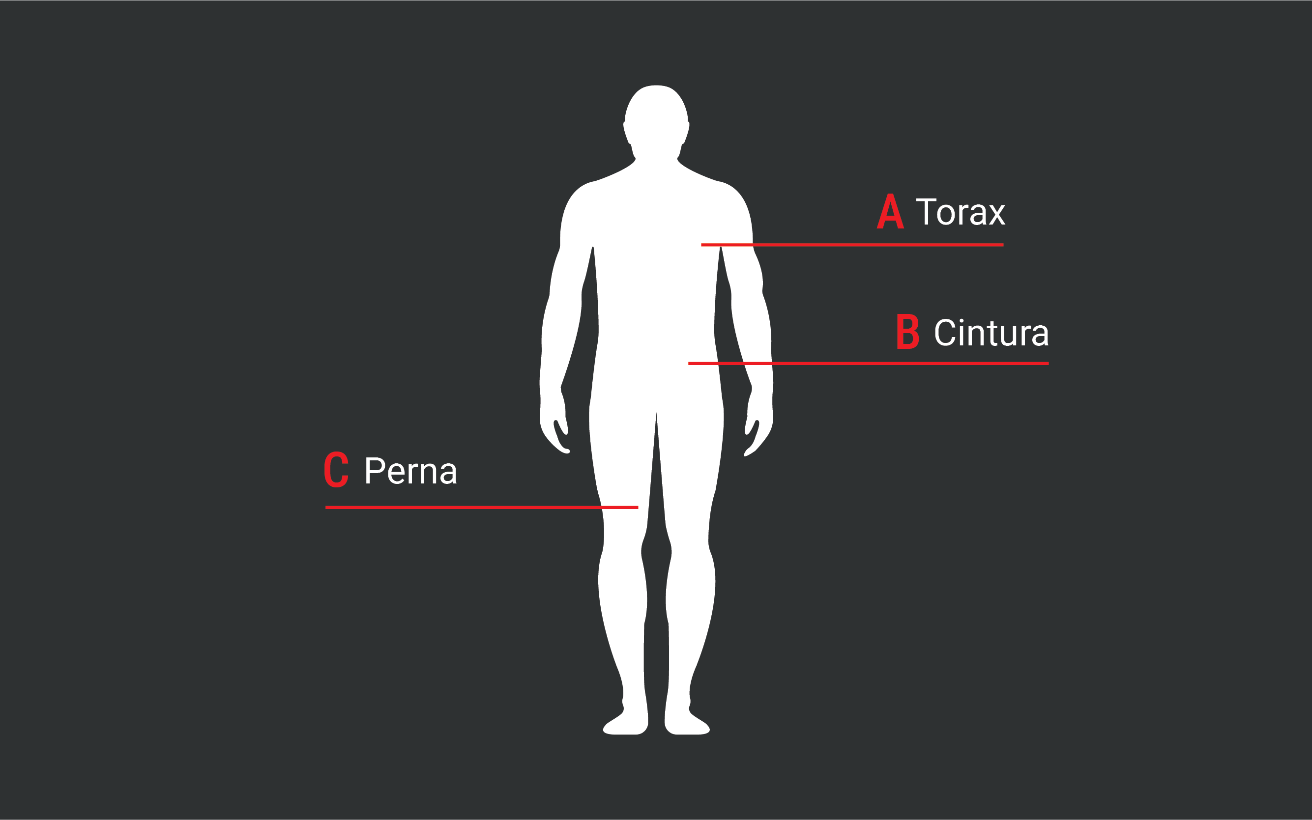 A - Tórax: medir a circunferência no ponto mais largo do peito, segurando a fita métrica na horizontal.